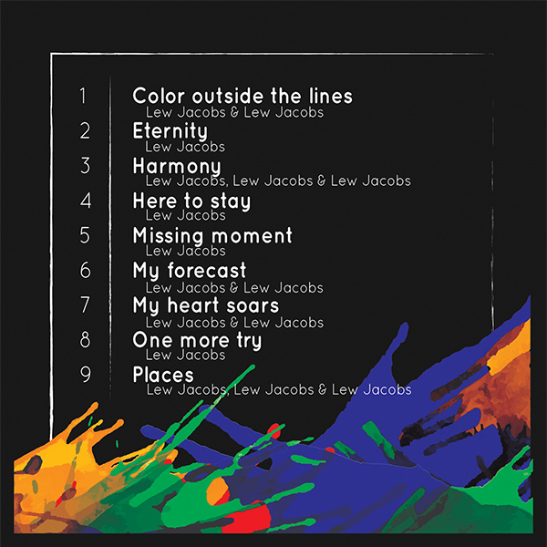 Album design for the album "Color Outside the Lines" from American musician Lew Jacobs. "Lew Jacobs blends acoustic folk and jazzy R&B melodies together with lyrics of love, life and hope that feed the soul."The album design derives from the album title through the usage of color splashes that go outside the lines. Color splashes are used to visualise the beautiful chaos that is life.This project included the design of the outside(front and back cover) and inside sleeve of the CD.